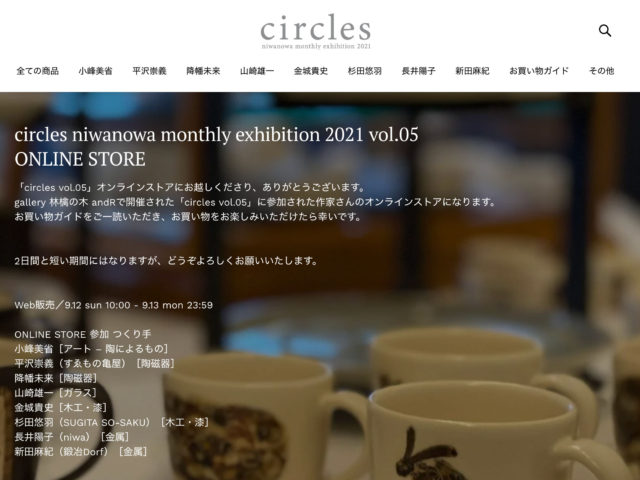 お知らせの記事一覧 お知らせ 「circles vol.05」 ONLINE STORE 本日最終日となります 2021.09.13 お知らせ 「circles vol.05」 ONLINE STORE オープンいたしました 2021.09.12 お知らせ 明日10時より「circles vol.05」 ONLINE STORE オープンいたします 2021.09.11 お知らせ 「circles niwanowa monthly exhibition 2021 vol.05」明日が最終日となります 2021.09.06 お知らせ 「circles niwanowa monthly exhibition 2021 vol.05」初日終了いたしました 2021.09.04 お知らせ 【セルフ梱包とエコバッグの持参のお願い】 2021.09.03 もっと見る