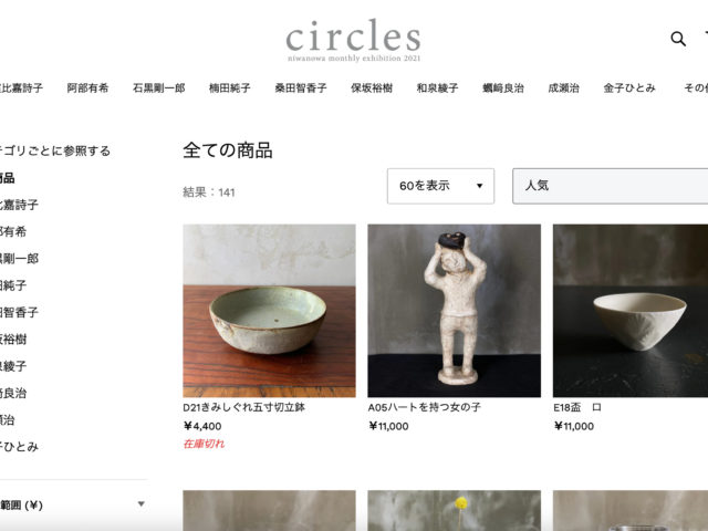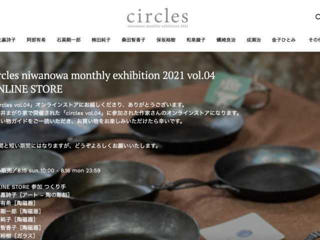 お知らせの記事一覧 お知らせ 「circles vol.04」 ONLINE STORE 本日最終日となります 2021.08.16 お知らせ 「circles vol.04」 ONLINE STORE オープンいたしました 2021.08.15 お知らせ 明日10時より「circles vol.04」 ONLINE STORE オープンいたします 2021.08.14 お知らせ 【circles vol.04 にわのわテレビと取材記事】 2021.08.06 お知らせ 【セルフ梱包とエコバッグの持参のお願い】 2021.08.06 お知らせ,出展者 circles vol.04 出展者展示会場と在廊予定 2021.08.05 もっと見る