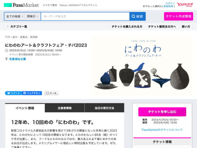 お知らせの記事一覧 お知らせ いよいよ本日からチケット販売開始となります。 2023.04.25 お知らせ,ボランティアスタッフ 一緒に「にわのわ」を作り上げてみませんか? 2023.04.15 お知らせ にわのわ2023のメインビジュアル公開 2023.04.01 お知らせ,出展者 にわのわ2023アート&クラフト部門出展者の発表です! 2023.04.01