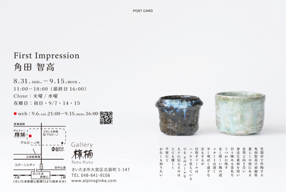 - Open 11:00-18:00 / ※火曜日、水曜日はお休み / ※在廊日 初日、9月7日、14日、15日